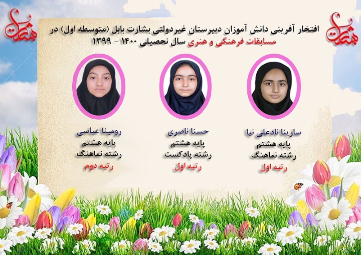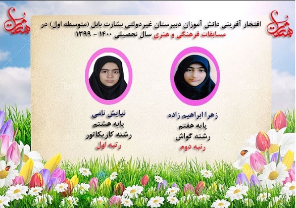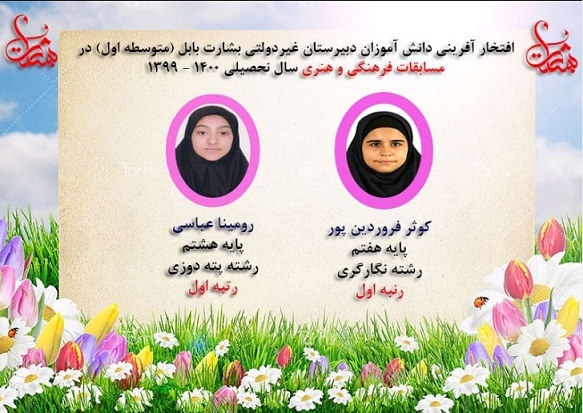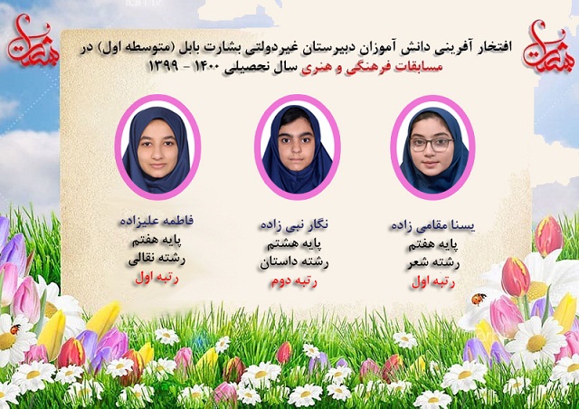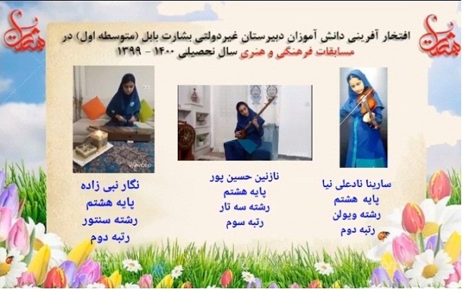 کسب 15 مقام برتر در مسابقات فرهنگی و هنری در رشته های . 1. موسیقی / 2. ساخت نماهنگ / 3. ساخت پادکست / 4. داستان / 5. نقالی / 6. شعر / 7. نقاشی / 8. کاریکاتور / 9. نگارگری / 10. پته دوزی / 11. لالایی خوانی /